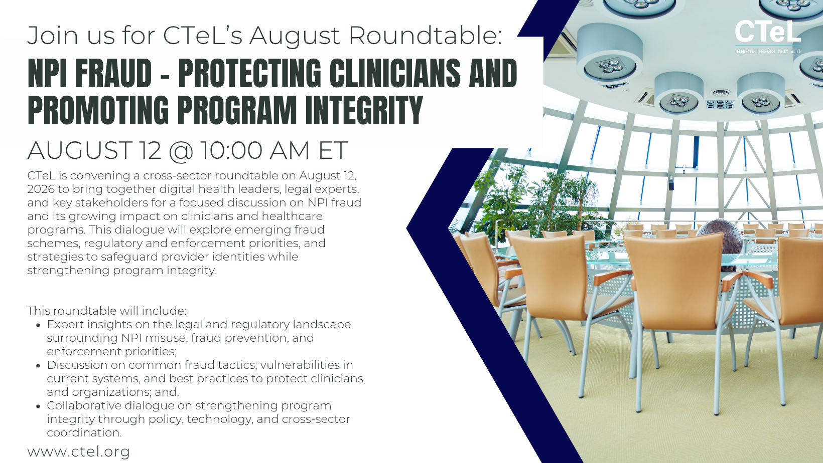 CTeL is convening a cross-sector roundtable on August 12, 2026 to bring together digital health leaders, legal experts, and key stakeholders for a focused discussion on NPI fraud and its growing impact on clinicians and healthcare programs. This dialogue will explore emerging fraud schemes, regulatory and enforcement priorities, and strategies to safeguard provider identities while strengthening program integrity.